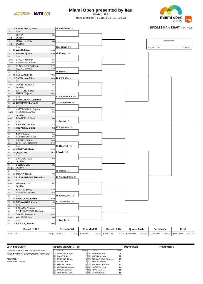 电竞平台-迈阿密1000赛签表出炉:郑钦文与萨巴又同区!次轮或战前美网冠军